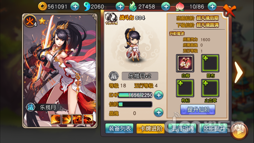 进入卡牌进阶界面就可以看到卡牌当前的仙阶,以及卡牌升阶所需要满足的条件:灵力、晶魄、五行等级,以及四种材料物品,全部集齐后,点击提升仙阶。