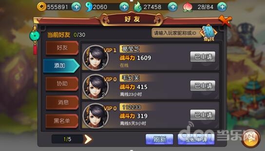 添加:在添加面板里你可以通过搜索你认识的朋友的昵称或者ID,来将他们加为好友,不只是认识的人可以做朋友,每一个朋友都是从最初的相识开始的,点击全部申请可以一键添加好多好友。