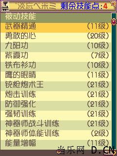 被动技能:九阳功10级,铁布衫功10级,武器精通11级,鹰的眼睛11级,勇敢的心20级