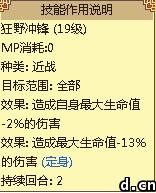 2。狂野冲锋。战所技能,20级扣自己1%血,打中扣全体14%血2回合,这个冲锋的对象是全体,包括自己和自己队友。所以只适合单人PK。这技能关键是不费蓝。和下面的恐惧凝视搭配用效果极好。