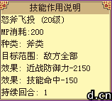 4.怒斧飞投20技,减少近战防御2190点自身命中150点,如果有3人使用能减少6570点近战防御,只用结合2人破甲攻击已经能减完10000点近防。