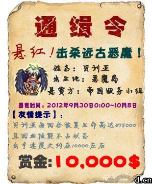 贝利亚真的不可能击败吗?俗话说“重赏之下必有匹夫”2012年9月20日帝国官方贴出一张关于贝利亚通辑令,悬赏10000金币和“超越bug之人”称号来招募玩家击杀“贝利亚”
