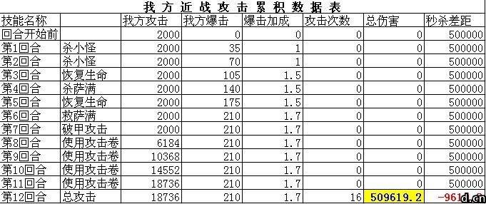 制定战术首先要有一个大的方向,贝利亚的总生命值“50万”就是一个突破点。帝国的伤害最大上限是32767并有自动技和主动技,宠物也即是如此。帝国组队模式是5人5宠,这说明我们有20个攻击机会,如果能全部打出攻击伤害能打出655340的伤害总值。但是我们不可能都用来输出,生存下来才是最重要的。50万生命需要16次的伤害如果能够满伤可达524272伤害。就是说,我们可以有4个人或者宠物不需要2次攻击。为了方便玩家更清楚的了解数据方面的计算,特别做出一张表格。下表是以2000近攻为例进行的计算,没有算入宠物使用暴怒的额外攻击都足够达到攻击要求,请看表格:
