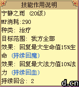 7.宁静之雨,猎人技能,恢复我方生命15%法力10%,持续回血,回蓝状态,持续2回合。在本次战斗中,敌方怪物“亚亚”的自动技能【魔法试探】是要吸蓝50%的,所以很有可能在2-3回合时,我方使用“法力潮汐”的角色的法力被抽干,所以在整场战斗中必须要有另一个恢复法力的角色应急辅助且两名角色站位要隔开十字范围,防止一起被抽蓝。