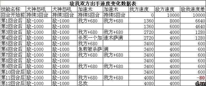 两只犬神幼儿减出手6000,5回合的加速术间隔使用是提高2040,有两名就是4080出手 如此一来,我方出手速度便可高于贝利亚了。也许很多玩家不太擅于进行数据计算,没关系我为大家做出了一个表格,大家可以清楚的从表格中看到每一回合我方和敌的出手速度的变化: