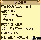 宠物再怎么极品养成,想让雷电蓝龙自身达到满伤近攻是不可能的,这样一来我们需要道具辅助。在众多道具中,国家十一级道具店中价值150银的【群体超越近战攻击卷轴】最合适我们使用。增加攻击1046持续5回合,如果四个人连续使用4回合可叠加近战攻击16736点近攻。