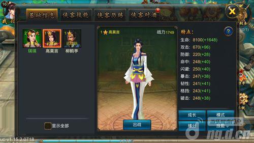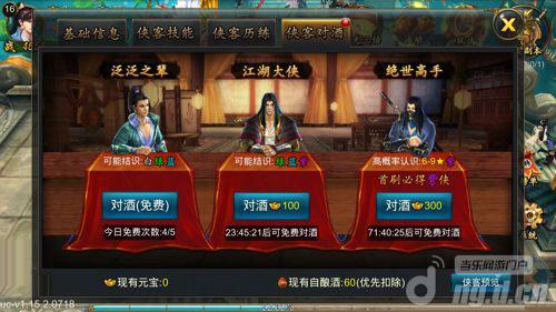 侠客品质分为白、绿、蓝、紫,可以通过侠客对酒来进行招募,还可以通过消耗提升侠客的等级。