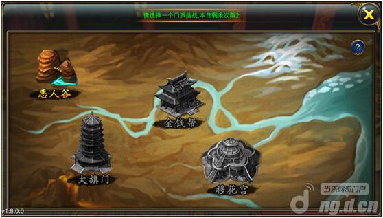 横扫江湖玩法是一个单人闯关的玩法。玩家可以从4个门派中的最低的恶人谷打起,一直经历大旗门、金钱帮与移花宫的考验。每次进入门派场景后,玩家可以从3个门中选择一个难度进行,分别对应的是: