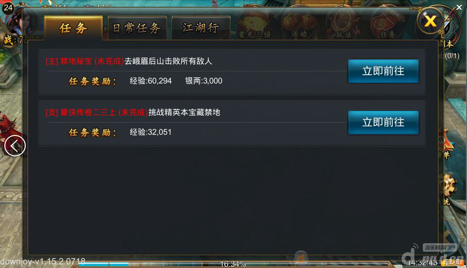 从小伙伴们刚进游戏开始,就会接到一系列的任务,点击右上角的任务按钮就可以看到武侠外传里的任务具体分为普通任务、日常任务、江湖行三个系列,做任务除了给你大量的经验外,还会附送你一定的银两和真气。在完成任务时NPC大人还会送你额外的战斗力!所以需要速速升级的小伙伴注意一个都不要落下噢~