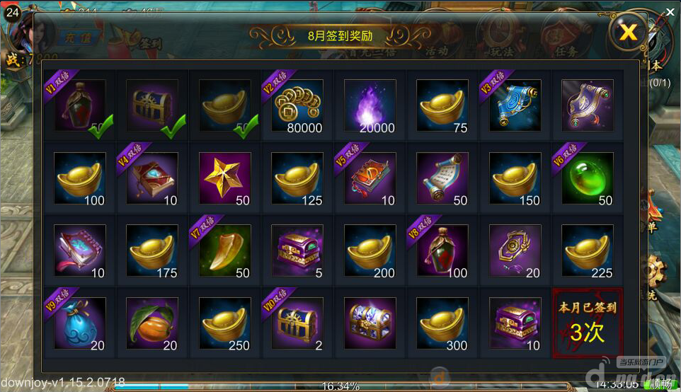 最后就是游戏里不可或缺的签到系统,武侠外传的签到在左上角,签到除了有大量的经验,还会获取各种实用宝物!小伙伴们千万别忘记噢!