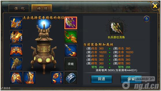玩家可以对附加属性进行洗炼,来获得自己心仪的属性。每次洗炼都会消耗一定的银两,如果对洗炼的结果不满意,还可以回退回原本的属性。要注意的是每件装备的附加属性都会有固定属性,这些固定属性是不能改变属性的项而只能洗炼属性的值的。