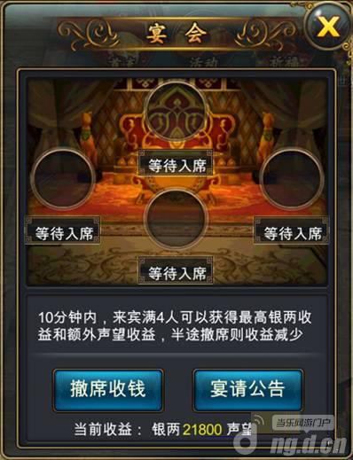 如果觉得银两与声望来得太慢,可以尝试一下摆设国宴。摆下国宴的玩家,会获得大量的银两与声望奖励。而其他玩家看到通告后,通过前来吃宴,也可以获得银两。吃宴的人越多,摆宴者的收益就越大。摆宴在10分钟后就会自动撤宴,要吃要喝的客官们都抓紧了。
