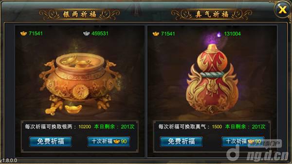 玩家可以通过祈福将身上的元宝转换成银两或者是真气。当亟需这两种资源的时候可不要忘记了这个方便的途径。
