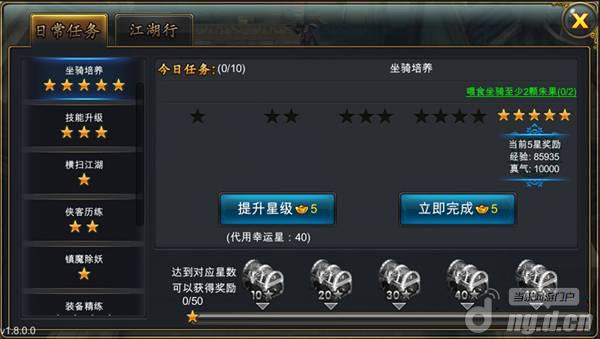 玩家每日上线都可以领取10个日常任务,这些任务都会围绕角色的各种强化而展开,只要每日轻轻松松对角色进行提升,这些任务也会很快完成。完成日常任务可以获得大量的真气与经验奖励。日常任务的星数越高,奖励就越丰厚。