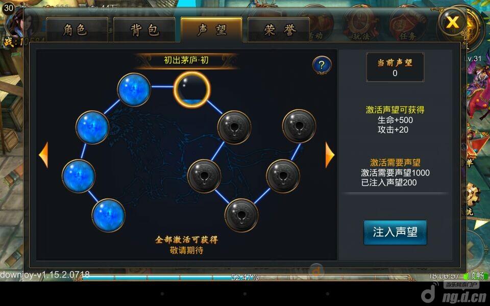 进入界面后,可以看到声望系统。在声望系统中,玩家可以通过注入声望来增强自己的人物属性,使自己的人物变得更加的强大。