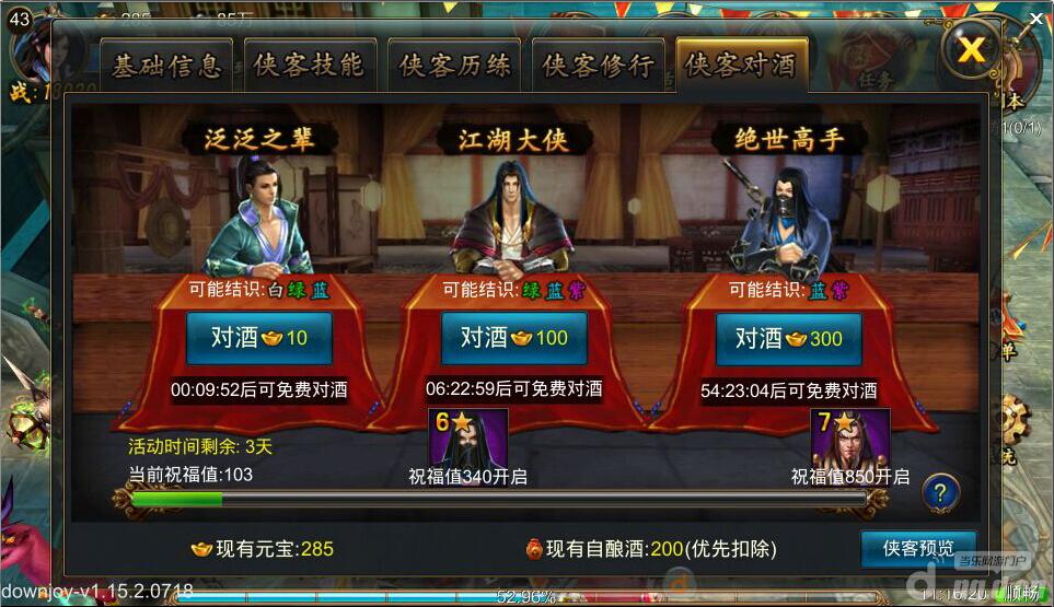 武侠外传的侠客相当于人物角色的宝宝,从一星到九星侠客战力逐渐递增,至今小编见过最高星级是8星,侠客玩家可以通过侠客对酒获取,也可以通过多人副本得到侠客历练令牌。总之,火拼看的不是人物单一战力,很多时候,侠客的战力高低,能帮你逆转局面。游戏此次更新后,对侠客对酒新增了祝福值,祝福值越高,出现高星级侠客几率越大。