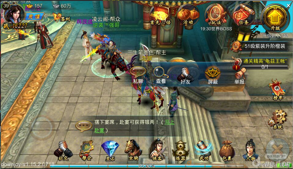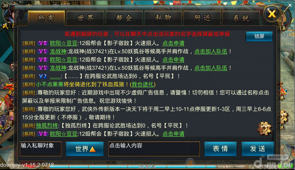 游戏社交系统很是清晰便捷,玩家可以在游戏界面直接点击人物,进行私聊、装备查看、加友、屏蔽和举报功能。聊天界面相对而言比较简单,游戏内的各种特色组队玩法可以直接通过聊天窗口看到并点击加入队伍。