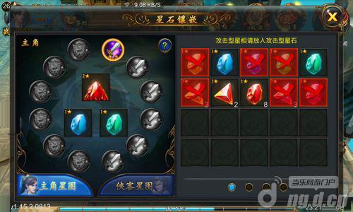 游戏里还有一个星石系统,主角和侠客都可以镶嵌星石。主角升到一定级数自动解锁镶嵌孔位,然后就可以放入星石增加属性,不过这个居然可以用元宝进行解锁,这会大大拉开RMB玩家和普通玩家的差距。