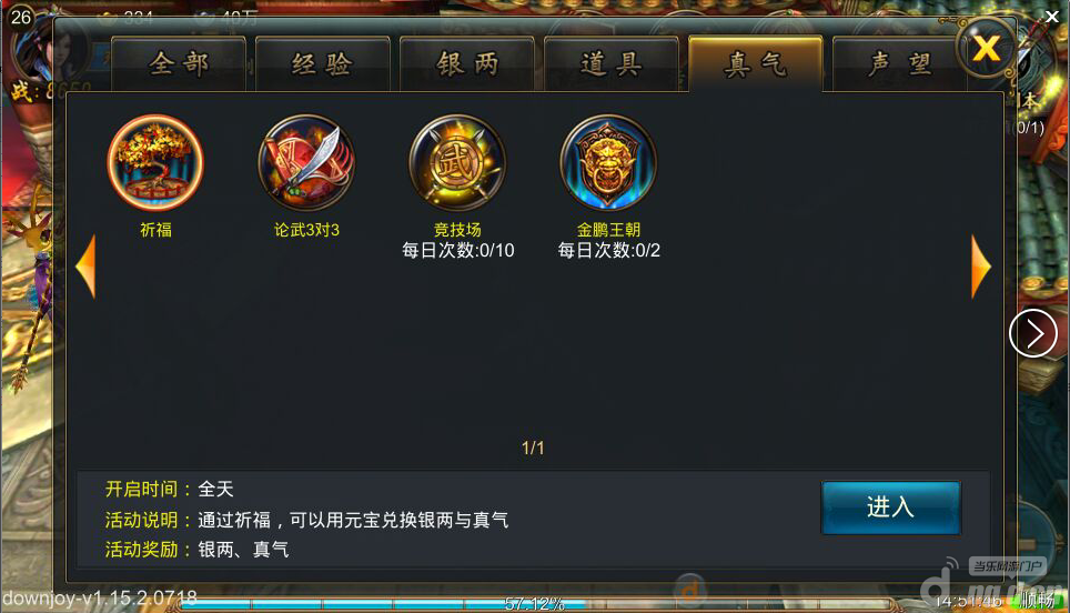这是小编要和大家重点强调的地方,游戏中玩家可以通过游戏界面上面的玩法入库进入玩法选项,里面有真气的子栏目。真气栏目中拥有四种获得真气的途径,分别是祈福,论武3对3,竞技场,金鹏王朝。下面小编就和大家一一讲解一下哈。