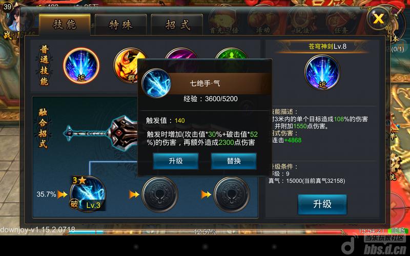 武侠外传的技能系统取名叫武功。里面区分了“技能”、“特殊”、“招式”三个类别,普通技能有4个,分别是近战技能苍穹神剑、群攻技能黑龙逆鳞、远攻技能血海飘香(这名字= =!)、治疗技能运功疗伤;特殊技能有3个,分别是旋转攻击的横扫千军,跳跃技能的飞星逐月,提升移动速度提高免伤效果的流星移位。