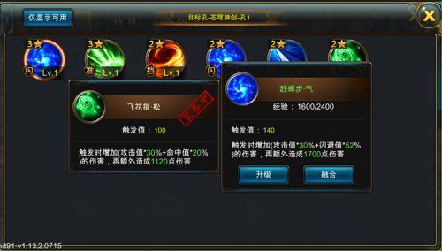 左侧显示玩家当前背包中的招式(已经融合的招式不显示在此)。右侧显示要升级的招式以及升级后的属性预览。