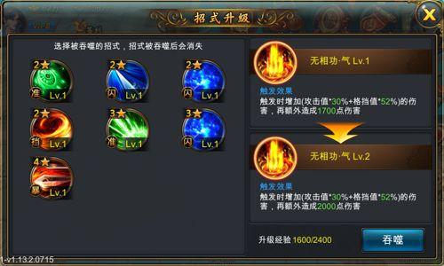 吞噬其他招式后,如果达到了升级所需的经验,则该招式就会提升一级,同时升级所需的经验上限往上提升。升级后,当前累计的经验保留。如0/100这样,升级后就会变成100/300,这个招式被吞噬后可提供100点经验。