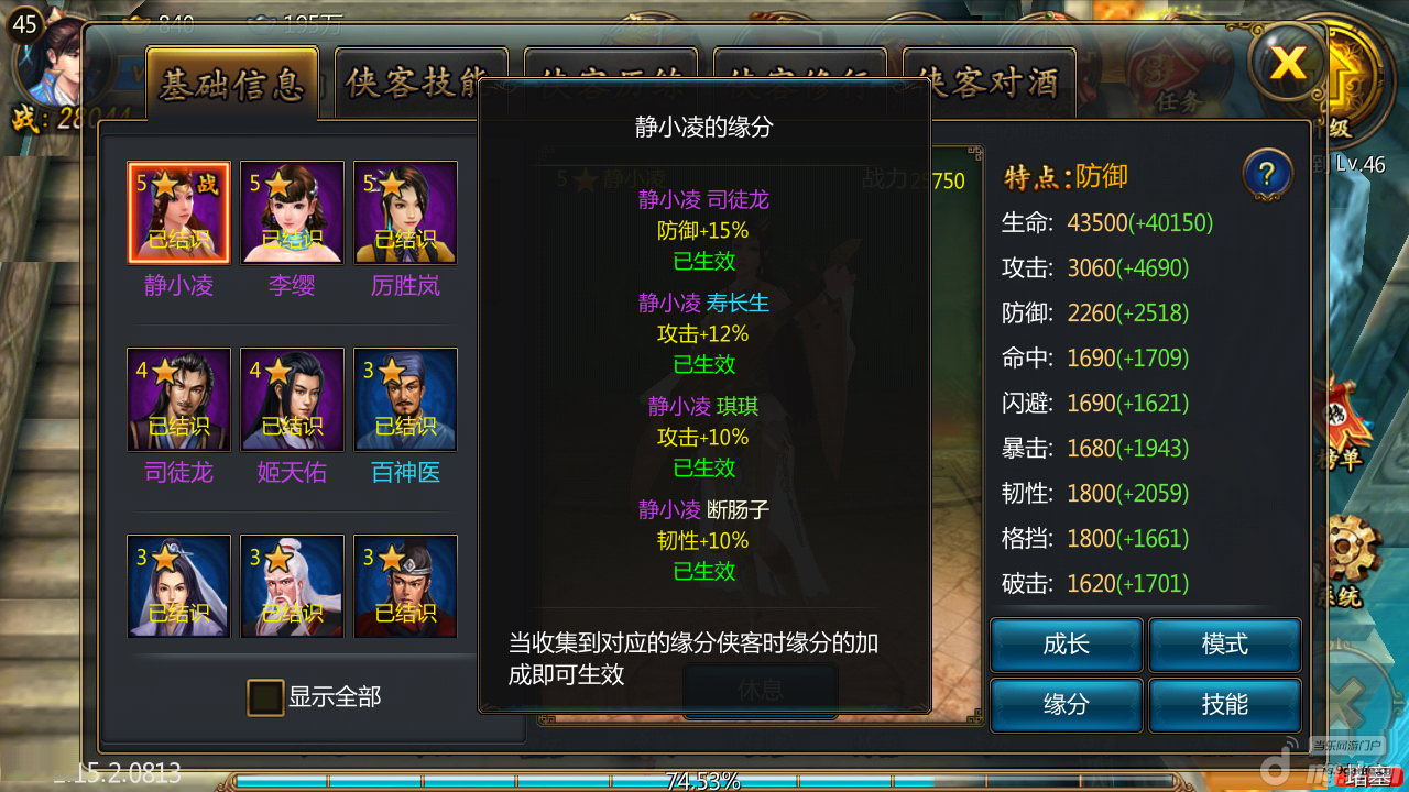 反正我得到的礼包是有300元宝以上的,自己在升到20差不多就够抽4次了!还有就是说下侠客缘分,全部齐了能加不少战力。当然这也是运气这张图是我的侠客缘分: