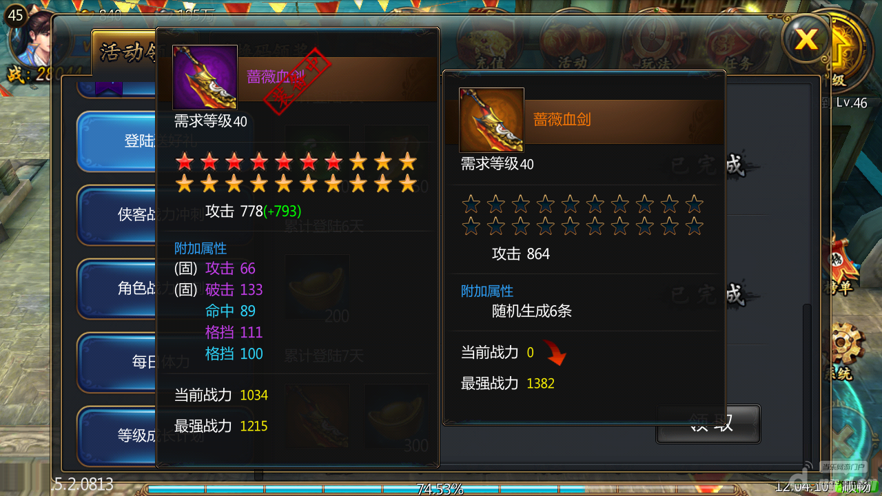 还有装备玩游戏的玩家都知道升级很快的,所以20,30.装备最好就强化到+10,40级时注意如果这时候打副本翻牌得到40级紫色武器(蔷薇血剑)不要去强化,登陆7天会送你一把橙的,我没注意看一口气强到+27。