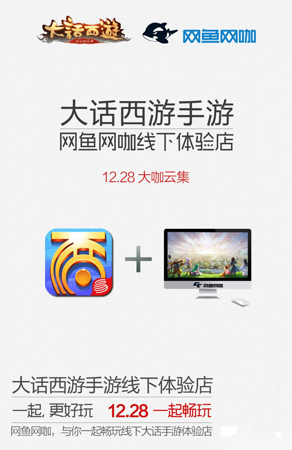 2015年12月28日-2016年3月27日活动期间,玩家到店内扫二维码下载《大话西游》手游,登录北京专服并登记玩家信息,若玩家当天在游戏中达到30级,信息验证后即得网鱼网咖20元现金券。当月玩家升级到100级,在网鱼网咖(北京翠微店)出示给店员,就能获得网鱼网咖100元现金券。
