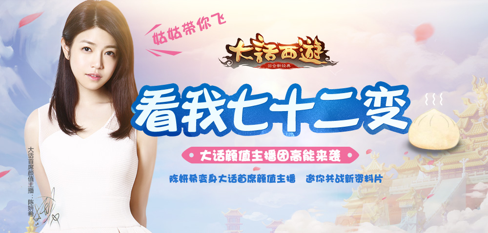 由大话女神陈妍希带来的新资料片全球首播,配合五大高颜值美女主播五大平台轮番游戏直播,将从画面、游戏内容、新增玩法等方面全面展示,《大话西游》手游“七十二变”新资料片。11月14日起,《大话西游》手游将迎来全新游戏直播盛宴,新增的游戏玩法,与女神、美女主播的全新互动形式,让我们共同期待!