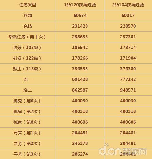 完了我开始做具体经验的测试工作,具体数据如下,前边数据为120级经验后边的是2转104级的经验。通过比对可以看出来不管是单人任务还是组队任务120级和2转104级经验基本无差距,甚至塔给的经验2转号要比1转号多很多。