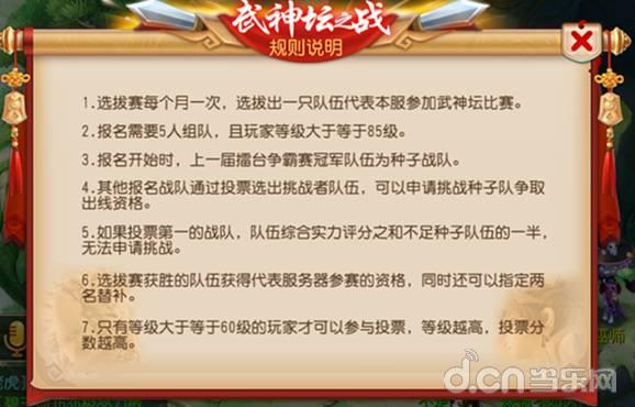 武神坛活动:2016年4月1号开始第一届武神坛活动报名,玩家可以通过长寿村的NPC战神山传送人(与端游不同的是,传送人不在长安哦,找不到的朋友应该前往长寿村90.85)前往战神山查看武神坛相关信息。活动规则如下: