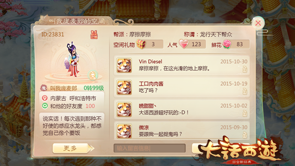 不仅如此,11月11日良宵节当天,《大话西游》手游还将在老服开启“大话佳人榜——帮派人气大比拼”活动。11月11日12:00至11月16日22:00活动期间,玩家可在个人空间上传照片,吸引帮派好友或其他玩家点赞送花,提升个人人气。人气值可通过大话佳人榜排名实时查看,每名参与点赞送花的玩家,都将得到丰厚的经验奖励。