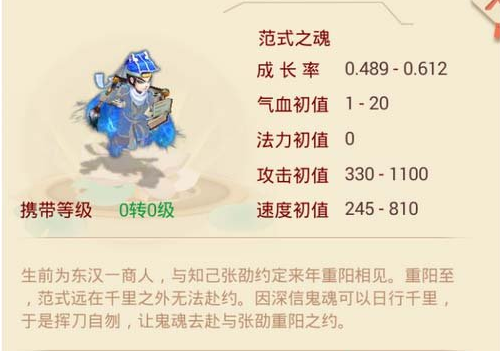 大话西游手游范式之魂基本属性介绍,生前为东汉一商人,与知己张劭约定来年重阳相见。重阳至,范式远在千里之外无法赴约。因深信鬼魂可以日行千里,于是挥刀自刎,让鬼魂去赴与张劭重阳之约。这是游戏对范式之魂的介绍,下面一起来看其属性吧。