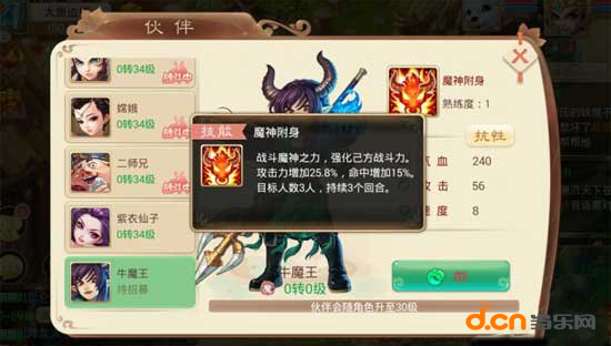 牛魔王这个伙伴是我们大家在游戏中最后一个能够解锁的伙伴了,所以在一定程度上面来看的话,实力也是最强的。技能名称为魔神附身,主要的效果就是能够使用战斗魔神之力,来强化乙方战斗力,攻击力增加百分之25.8,命中增加百分之15,目标人数的话是3人,可以持续3个回合,可以说是一个非常强大的辅助伙伴。