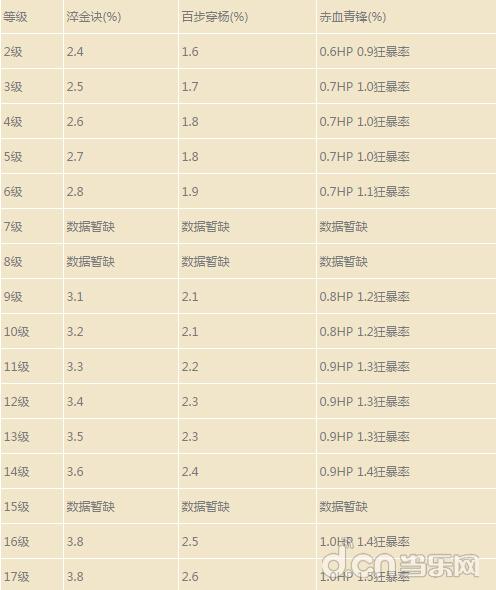 从上面的数据看,等级对技能的影响还是十分明显的,等级的培养非常的有必要,上面的还都是普通技能,如果是高级技能效果应该会更好。基本上等级提高一级,淬金诀和百步穿杨带来的伤害和命中提升都大约有0.1左右,由于四舍五入的原因并不是每级都显示增加了0.1,但是大约是这么个趋势。赤血青锋带来的HP和狂暴率提升就明显慢了许多。
