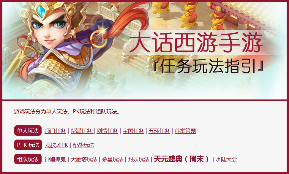 活动当天会在各个地图(普陀山、大唐境内、方寸山、大唐边境、东海渔村等地)出现带有天元盛典称谓的NPC,玩家需要至少3人及以上组队,去寻找万仙方阵战斗并取胜。