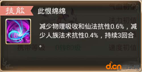 技能此恨绵绵(减少防御率、仙法和人族法术抗性,持续3回合)