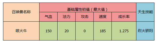 在两只即将登场的高级召唤兽当中,神情威严,酷劲十足的喷火牛无疑相当吸引眼球。帅气的外形配合附带天生技能“烈火骄阳”,让喷火牛在为玩家带来强烈视觉冲击的同时,也将在战斗中为玩家提供极大帮助。玩家可以通过野外捕捉的方式,入手喷火牛高级召唤兽。