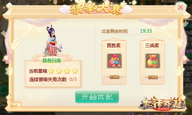 淘汰赛开赛时间为18:15,三局两胜制,胜利则有资格继续参与接下来的比赛,失败则会被淘汰出场,平局则继续与该对手挑战,直至有一方获得2回合胜利为止(每局最多50秒,超时未决出胜负将由系统随机判定),淘汰赛第一名的玩家可获得酷炫限时称谓“猜拳大师”。更有海量经验、聚魄丹、见闻录(时间服)、圣兽丹,1级神兵(道具服)等丰厚奖励助你玩转大话。最终究竟谁才是真正的大话猜拳王,让我们共同期待520的到来。