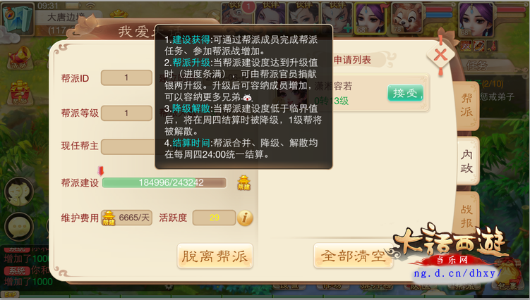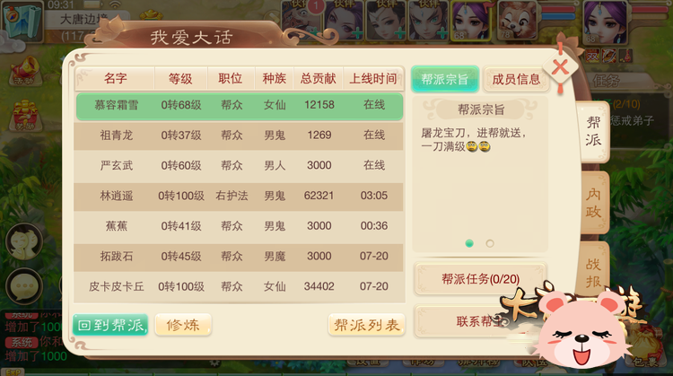 成员管理:帮派官员可以接受入帮申请,批准加入;对于屡犯帮规的成员,可由帮主开除出帮派。