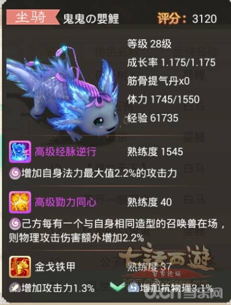 这个高级经脉逆行让我想到过全法扇子是不是可以法攻兼备,老鱼头是不是可以用鱼竿抽翻对面,现在看来想的有点多了,20w法目前也才加4400攻击,数值还是太低了,后期坐骑等级高了熟练度高了感觉能加个2w攻击很厉害了!可是2w攻击也不怎么厉害啊,主要是这个坐骑技能对管制很多其他物理宝宝更加没啥效果了。