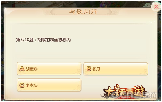 答题有礼,玩转新服,《大话西游》手游为胡歌粉丝准备的胡歌粉丝专区“有胡同享”在今日12:00震撼上线,“有胡同享”是为大话和胡歌粉丝提供了绝佳粉丝体验的全新服务器。为庆祝胡歌官方粉丝站的成立,武林盟主再次来到长安给各位粉丝带来专属福利,武林盟主会举办答题活动设立与大话和胡歌相关的问题,考验玩家对大话和胡歌的了解程度,参与答题活动得到武林盟主认可的胡椒粉,将有机会获得从“模范胡椒”、“名椒志士”到尊贵的“ 千椒倾慕”、“万椒敬仰”的专属称谓!胡椒粉们赶紧到“有胡同享”胡歌专区参与活动吧!