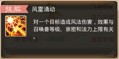 技能 风雷涌动(对一个目标造成风法伤害,效果与召唤兽等级,法力上限有关)