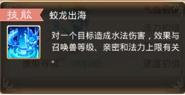 技能 蛟龙出海(对一个目标造成水法伤害,效果与召唤兽等级,法力上限有关)