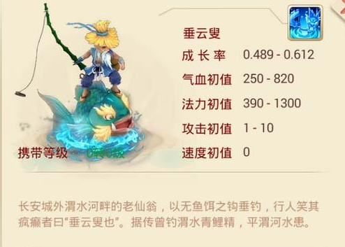 大话西游手游垂云叟基础知识讲解,长安城外渭水河畔的老仙翁,以无鱼饵之钓垂钓。行人笑其疯癫者曰垂云叟也, 看起来好像这个人物非常清闲的样子,希望在游戏中给力哦。