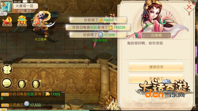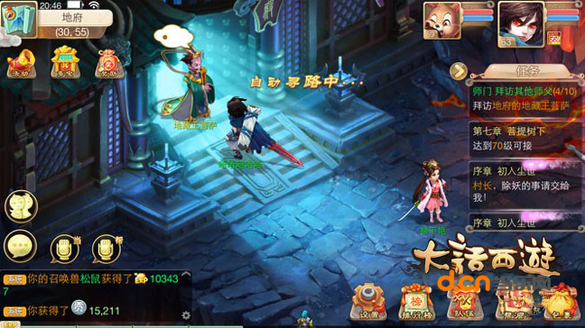 等级达到15级的玩家,系统会出现提示去接师门任务,每个玩家每天都可以完成20次(2轮,10次/轮)的师门任务,可以获得大量的经验、银两还有道具。