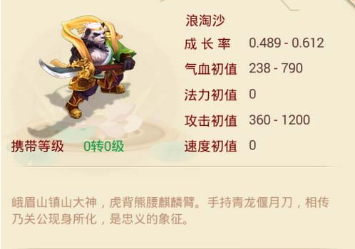 大话西游手游浪淘沙图鉴一览,淘沙是峨眉山镇山大神,虎背熊腰麒麟臂。手持青龙偃月刀,相传浪淘沙乃是关公现身所化,是忠义的象征。不过这个人物在大话西游手游中没有技能,这有点遗憾。