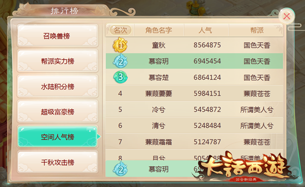 累积一定数量的点赞人气和鲜花数量,还将为玩家赢得代表个人魅力的空间人气榜排名。玩家可以通过空间人气排行榜,直接访问游戏中超人气玩家的个人空间,阳光帅气的男神,清新动人的女神,哪一个才是你的最爱?
