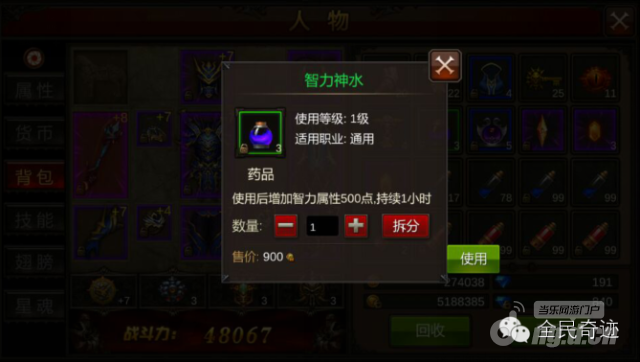 这上面显示属性点智力差很多,就吃加500智力的属性药水